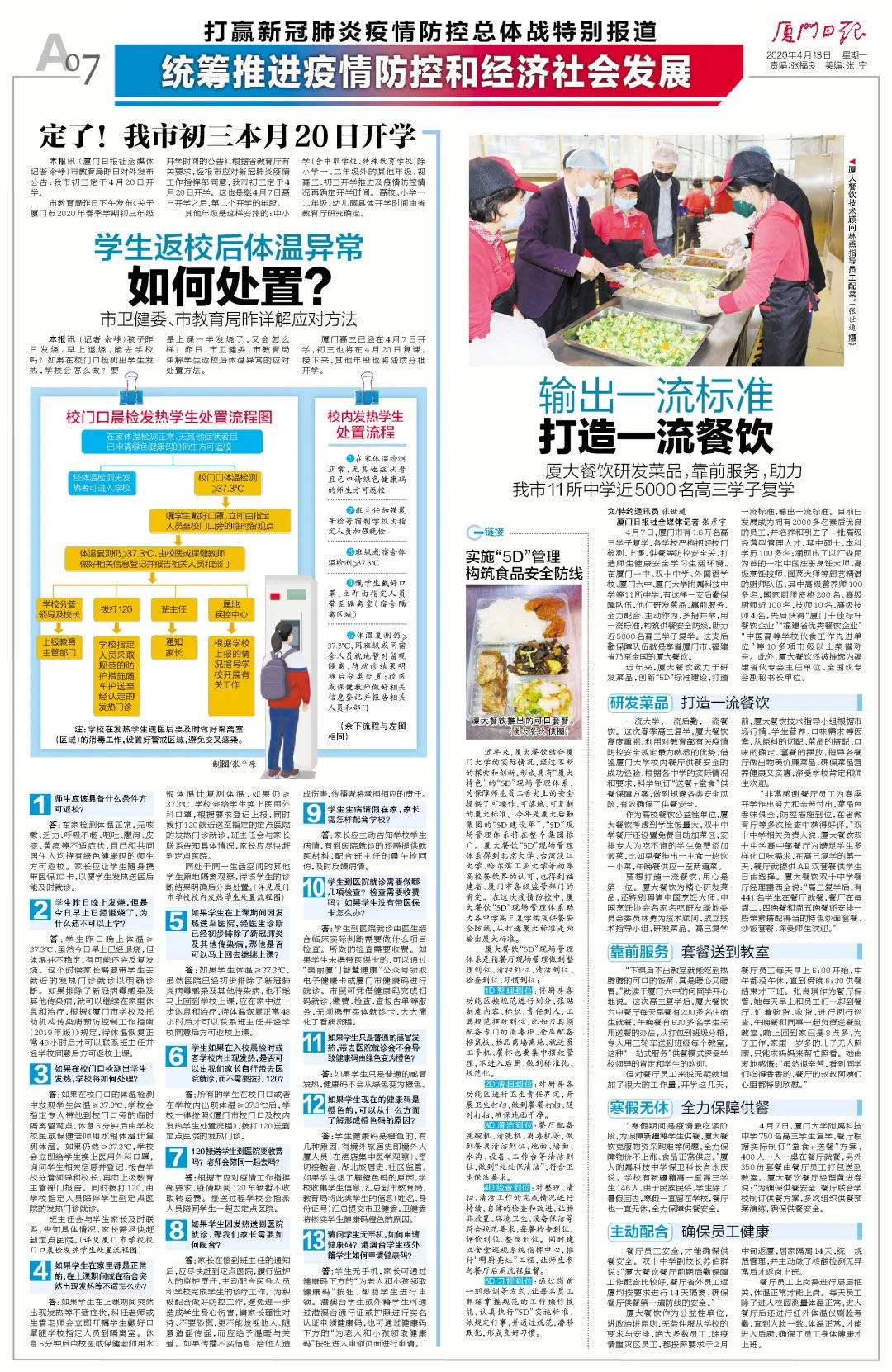 在2020年至2021年疫情期间,公司积极配合厦门市复工复产复学政策,强化公司食品安全管控、做好疫情常态化下的防疫与稳定供餐,《厦门日报》、《海西晨报》等报道不断,享有较高的社会声誉。