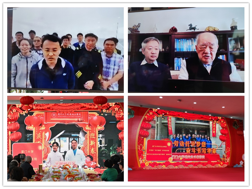 会议现场以视频连线方式与远赴南海的“嘉庚”号科考船上的师生以及田昭武老校长和田中群教授实时对话,共叙情谊。学校师生员工代表、附属医院代表也通过视频形式抒发新春美好祝福。