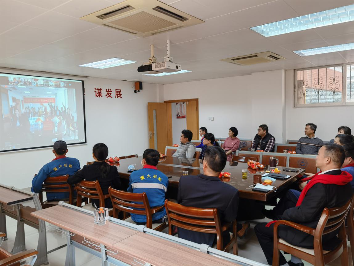 2月5日上午,厦门大学举行以“喜迎百年新征程”为主题的2021年新春云茶话会,共迎新春佳节,茶话会以“线上”和“线下”相结合的方式举行,主会场在科艺中心二楼大厅,后勤集团党委书记杨云良和副总经理刘君彬、王裕民,与抗疫优秀共产党员、先进个人等在集团会议室观看网络直播。