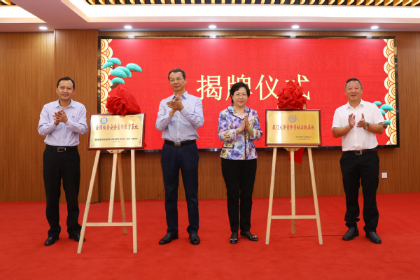 赖虹凯、邓朝晖、李峰、林公明共同为“全国粮食宣传教育基地”、“厦门大学青年劳动实践基地”揭牌。