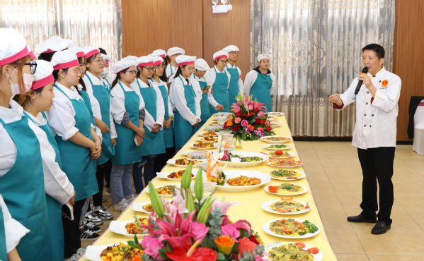 揭牌仪式后,“新时代中国特色社会主义劳动教育”第一期实践课程开班,饮食服务中心主任、中国注册烹调大师江森民为同学们进行理论讲解和实践教学,四名厨师分组指导学员实操并作点评。