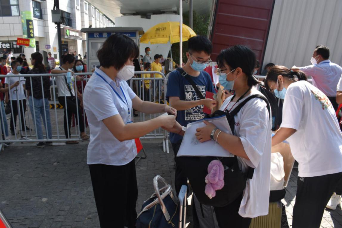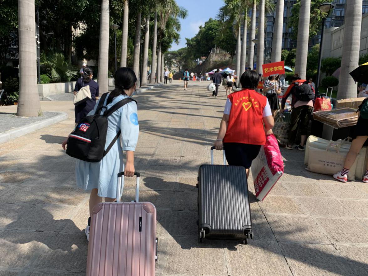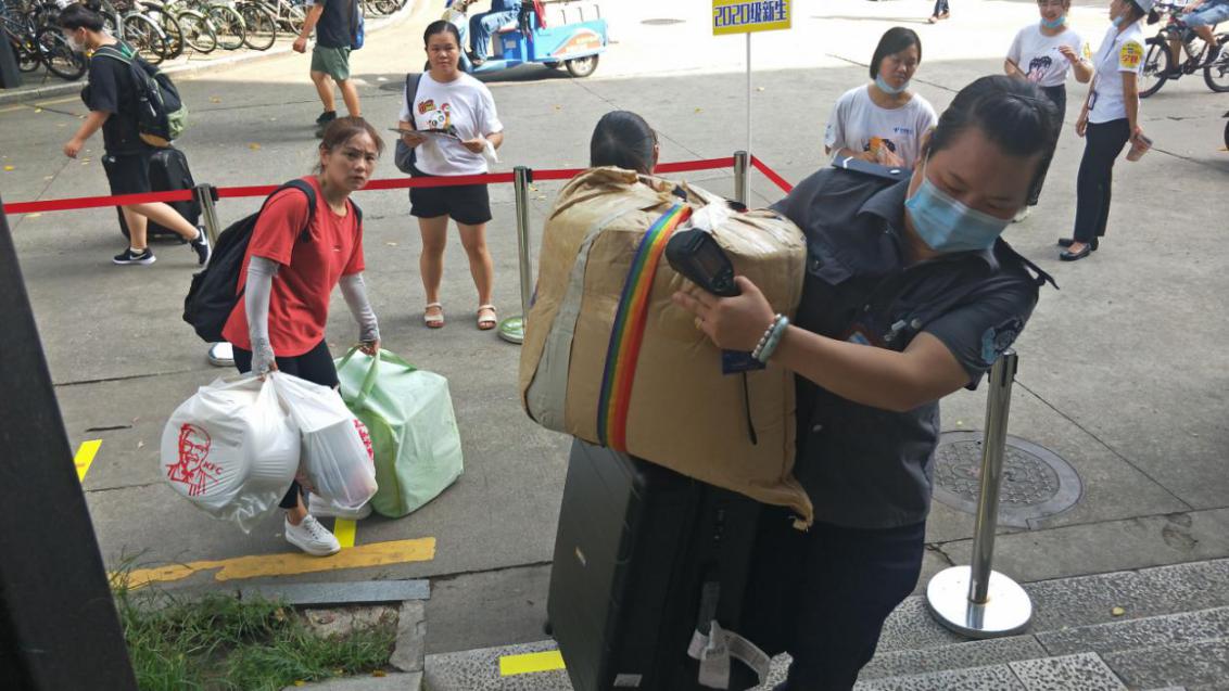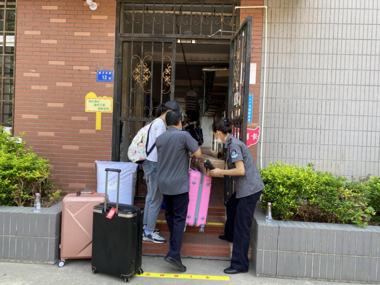 在宿舍园区,中心在各宿舍片区设立了入住办理点,为新生发放宿舍钥匙、空调遥控器等,确保新生安全顺利入住。宿舍工作人员各司其职:有的引导新生按照指定通道进行体温检测后进入园区和宿舍楼栋,有的认真发放宿舍钥匙,有的耐心解答新生住宿问题。部分宿舍安防员在维护好秩序外,还主动帮助新生搬运行李,服务周到又暖心。