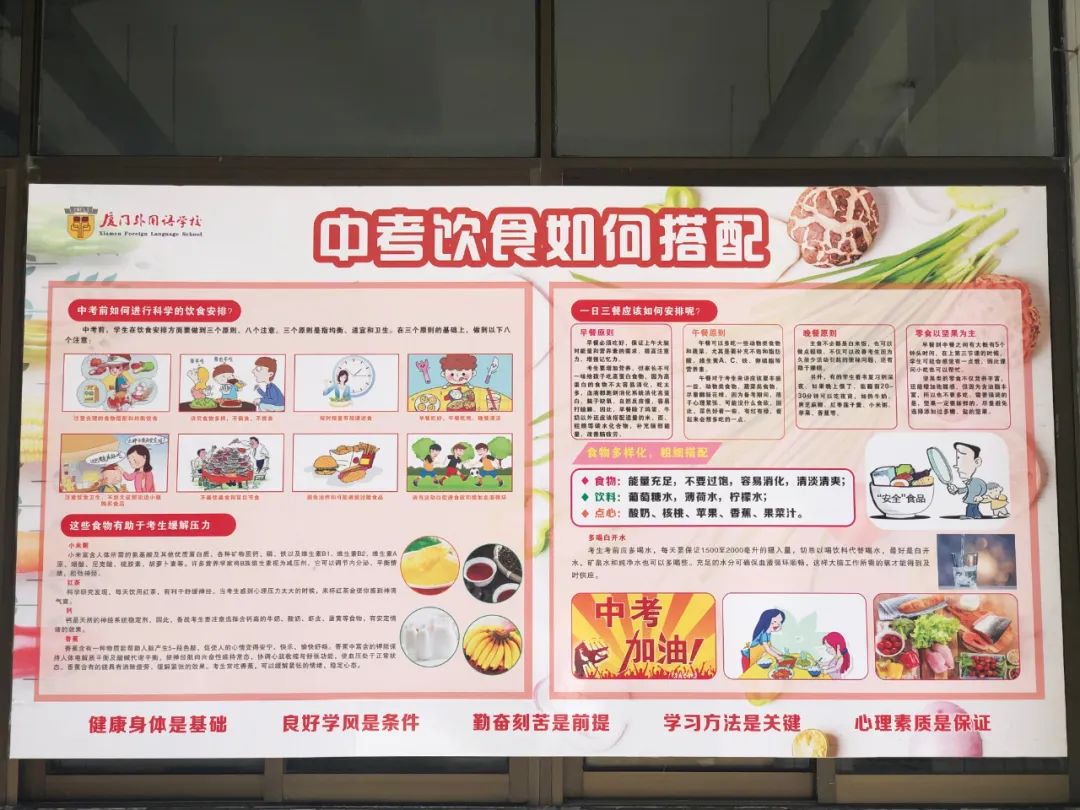 餐厅叔叔阿姨们用心挂横幅、贴标语、增设米饭、肉酱、小菜添加处、送餐到教学楼,为中考学子提供便捷的餐饮服务,让考生吃得放心、考得舒心!