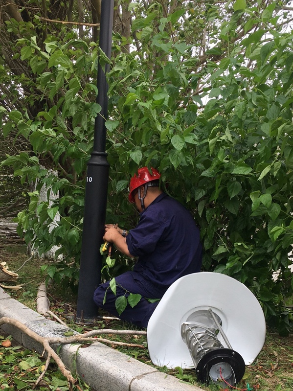 台风过后,中心迅速组织员工对校区内配电室、路灯等水电设施设备进行灾后恢复及安全巡查检修。