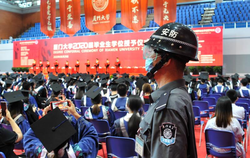 6月29日下午,校2020届毕业生学位授予仪式(翔安校区)在综合体育馆成功举行。服务办对本次活动的保障服务工作高度重视,多次召开工作布置会,服务办主任汪尚谦到现场跟进督促。校园服务部场馆组提前与场地设计公司、校区办、学生办就场地布置规划、灯光音响舞台设备配合、座位编排等细节进行沟通、协调,加班加点做好红地毯、座椅、饮用水及防疫物资的布置工作,并制定了应急预案。安防组负责整个会场的安全检查、秩序维护、不定时巡逻,确保安全与服务并行。