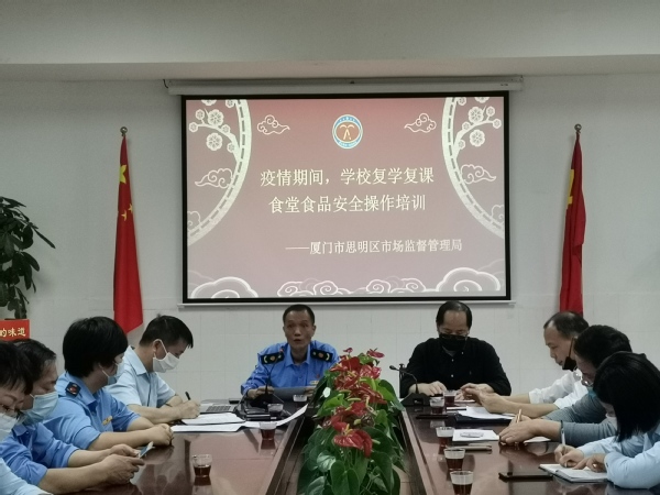 4月29日上午,饮食服务中心召开迎接学生返校工作布置会,传达学习了学校和集团关于做好学生返校复学的会议和文件精神,部署了学生返校疫情防控和工作安排,集团党委书记刘立荣、副总经理陈有亮分别讲话,厦门市市场监督管理局思明区中华所队长黄建成为大家进行复学复课食堂食品安全培训,中心全体二级岗及以上人员、现场管理和厨师长出席会议。会议由饮食服务中心江森民主持。