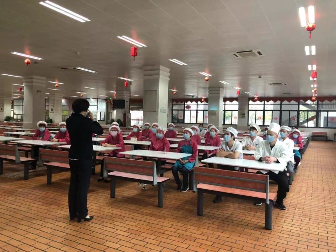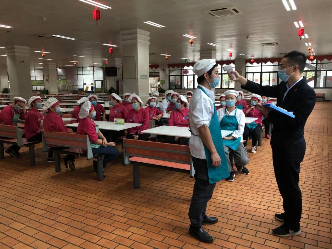 近日,正常供餐的餐厅均严格执行晨检记录,测量体温,所有人员佩戴口罩上岗。餐厅也在“岗前一课”上为员工宣导正确的防范知识,强调纪律,确保安全供餐。