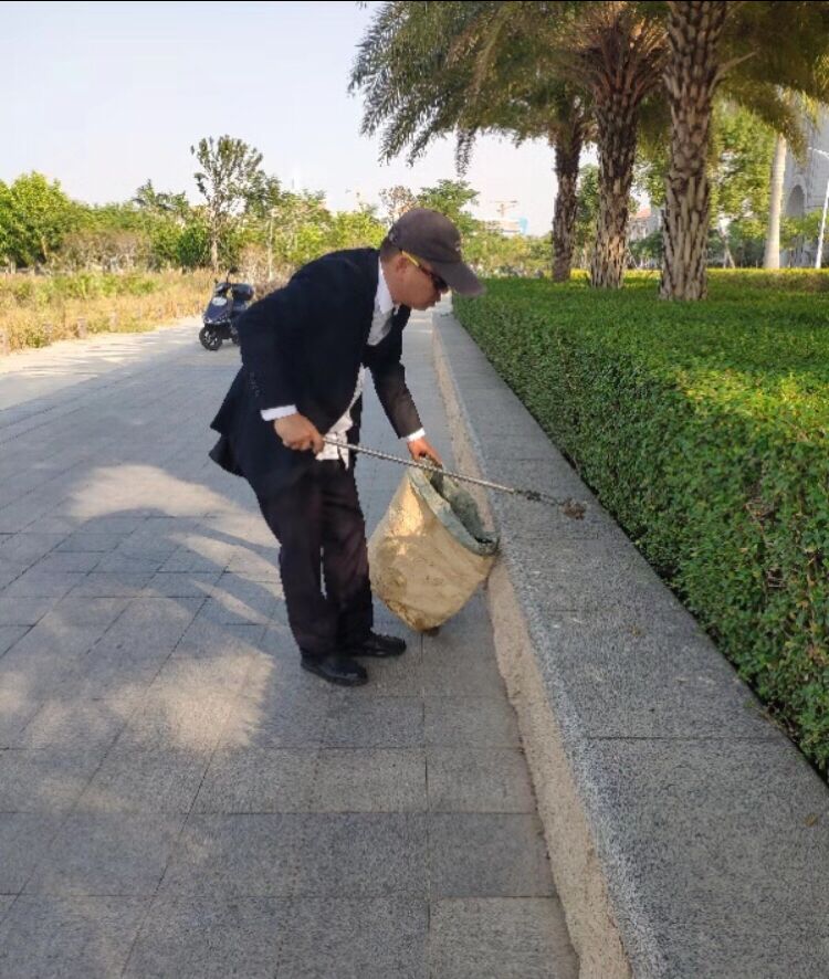 在翔安校区,经常可以看到一位中年男子左手拎个垃圾袋,右手拿着长镊子,一路走一路看,地上的烟头、瓶子等垃圾被他一一夹起来放入垃圾袋,动作轻快而麻利。校区师生大多不知道他的名字,但他的身影给大家留下了深刻的印象,只要一提起他,大家都纷纷称赞。