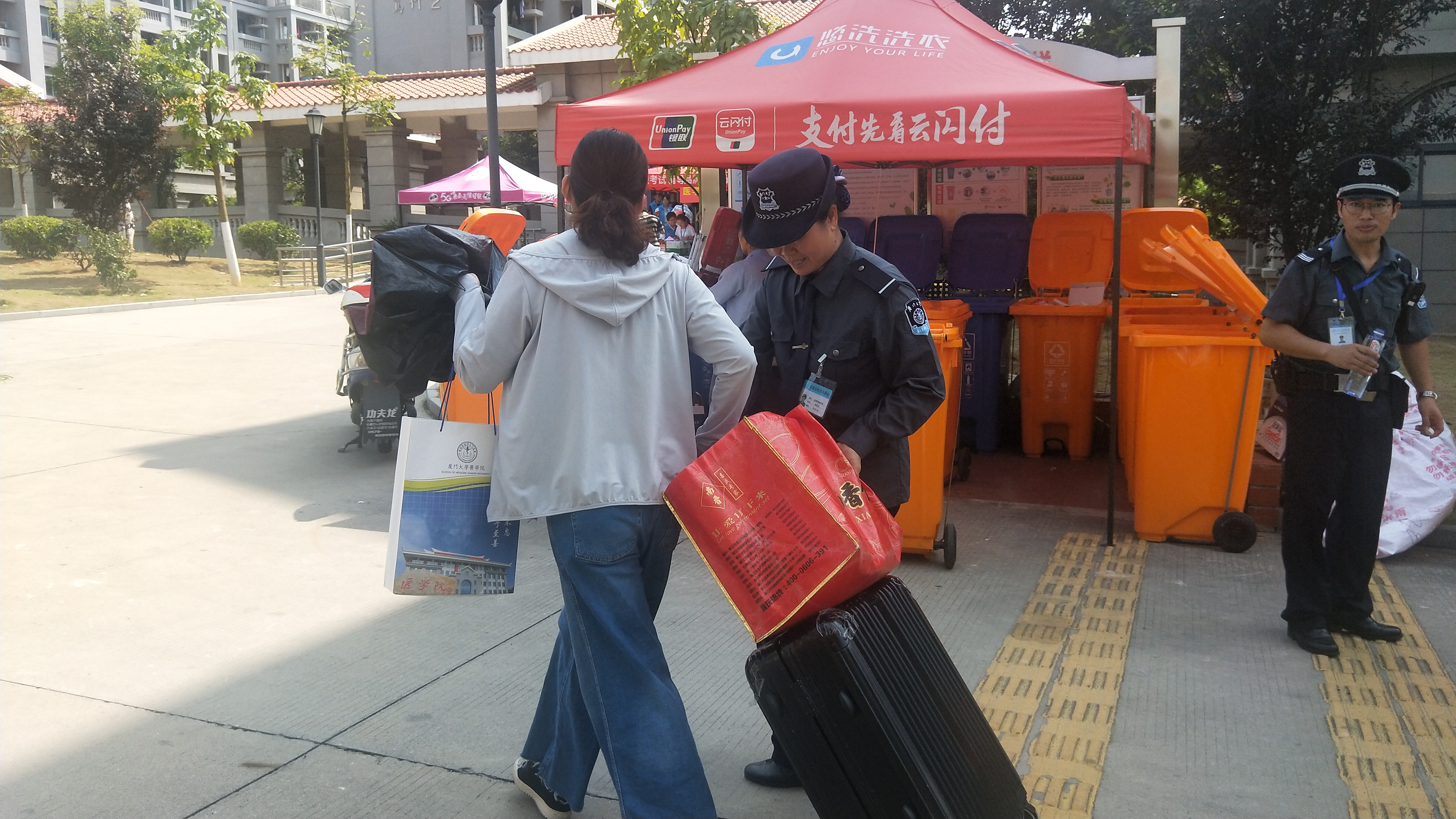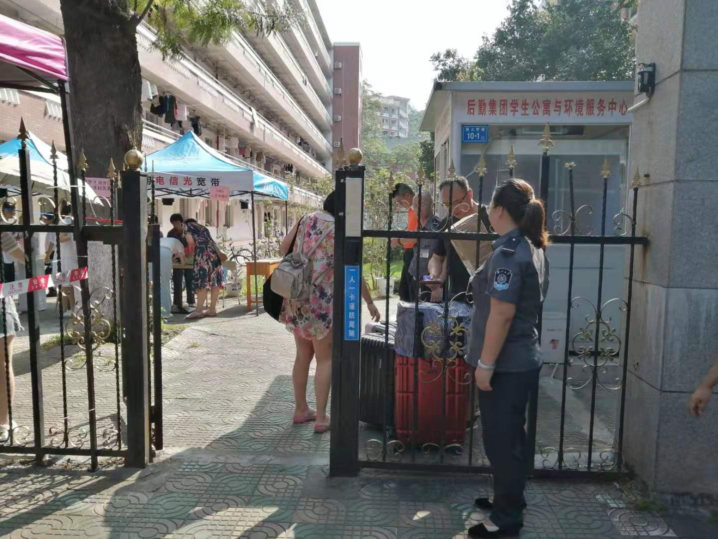 在校园安全第一防线上,校门安防员认真查看录取通知书,严格按照学校规定管控和疏导人员、车辆进出校门,让新生入校就感受到后勤人认真严谨的作风和热情周到的服务。到了宿舍,宿舍安防员不但为新生解答了住宿问题,而且还帮助新生搬运行李,服务周到又暖心。
