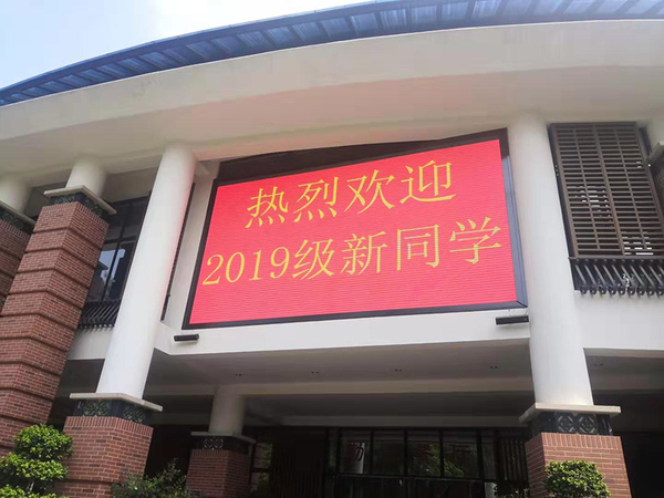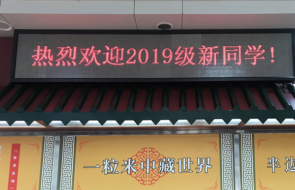 各餐厅LED屏上滚动播放“热烈欢迎2019级新同学”标语,迎接新生及家长的到来。
