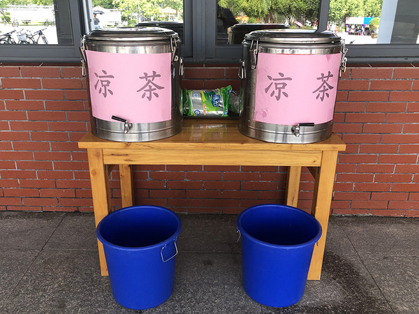迎新当天,骄阳似火,餐厅熬制消暑凉茶供新生及家长免费饮用,提前开放餐厅用餐区让他们休息歇脚。