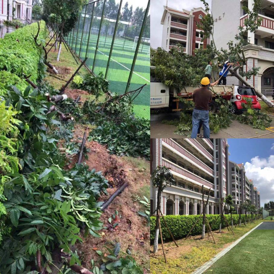 据不完全统计,校区共有107株乔灌木在大风暴雨中倒伏,特别是南安7南侧最为严重,共吹倒16棵,并砸到路边一部轿车。为保障交通通行,恢复绿化,后勤绿化员工加班加点对倒伏树木进行重新扶正、固定支撑、浇定根水,对被风刮断的枝条进行修剪,对路面上的树叶和树枝进行清理。