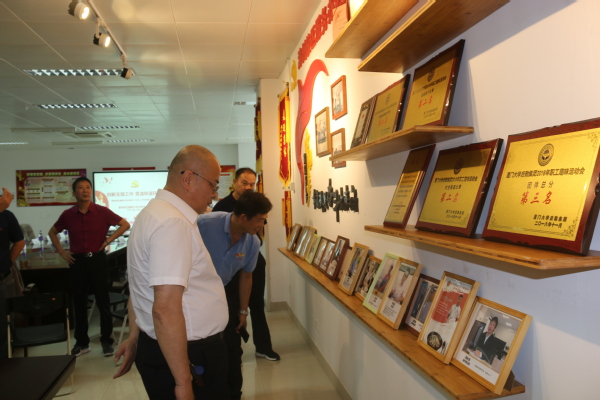 一行人结束北区职工宿舍的参观,来到漳州校区服务办党支部党员之家和职工之家。党员之家展架上支部历年获得的各项荣誉和在各自岗位上获得集团、校级、厦门市级荣誉的17名党员,以及职工之家荣誉墙上获得集团、校级、厦门市级荣誉的39名基层员工的个人照片,无不在向与会人员展示支部员工在秉承“三服务三育人”宗旨、发扬后勤精神、服务嘉庚学院师生员工、投身“一流后勤”建设过程中,也升华了个人的人生价值。
