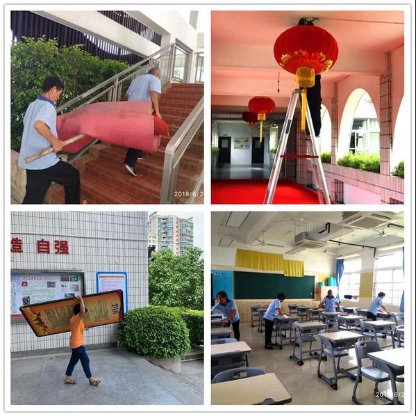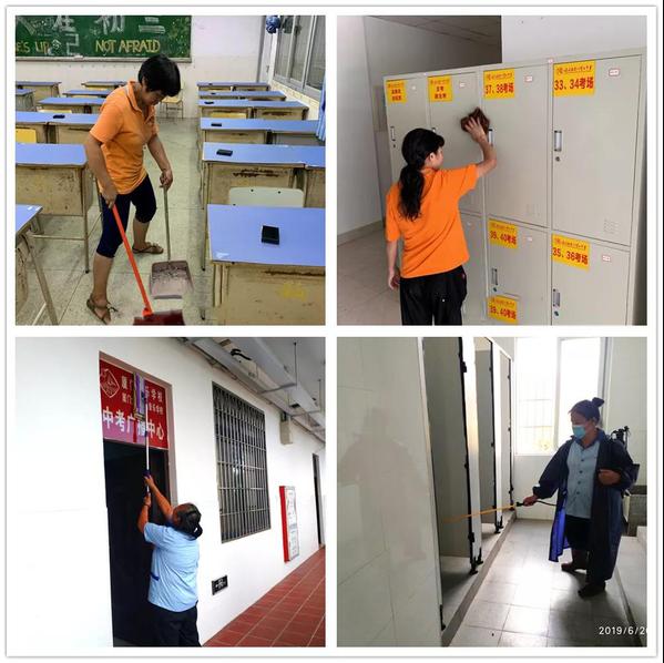 为确保学子们考场环境的整洁、安全,南强物业双十初中、外国语初中、音乐学校以及科技中学四个项目提前半个月就开始中考准备工作,见缝插针地利用好同学们的休息时间对教室进行全面、彻底清洁和考场布置,加强维序操练,排查校园内外安全隐患。