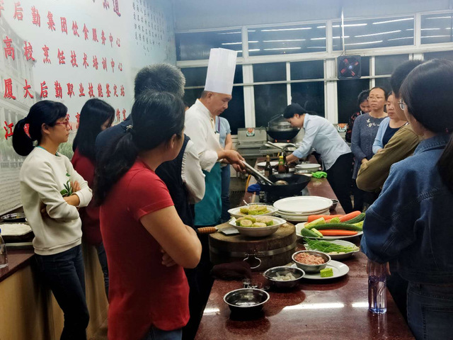 美味悦享,“烹”然心动。为纪念第109个“三八”国际劳动妇女节,弘扬传统饮食文化,引领健康生活理念,丰富教职工业余生活,校工会、校妇委会精心策划并举办了“美味生活”厨艺培训活动。该活动从3月22日起,共进行了五次培训,在5月10日晚思明校区海滨餐厅二楼培训教室举行的示范课上,校工会常务副主席叶鹏飞、副主席秦红梅等20余名教职工参与其中。