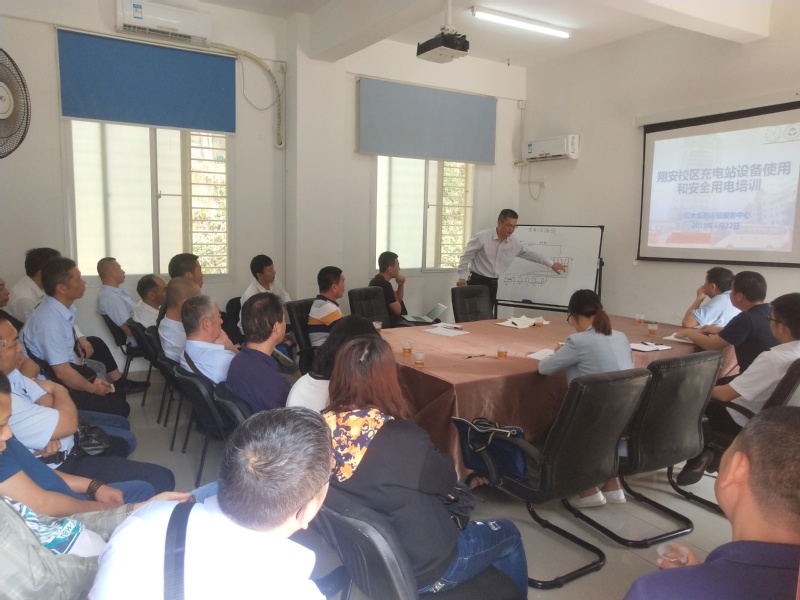 4月22日上午,运输服务中心在翔安校区大车库开展了电动汽车充电桩安全操作培训活动。本次培训邀请了充电桩供应方厦门宇邦电力设备有限公司的副总经理暨资深技术顾问王飞明为大家进行专业授课,集团副总经理王裕民出席了本次培训活动,活动由运输服务中心主任谢伟锋主持。