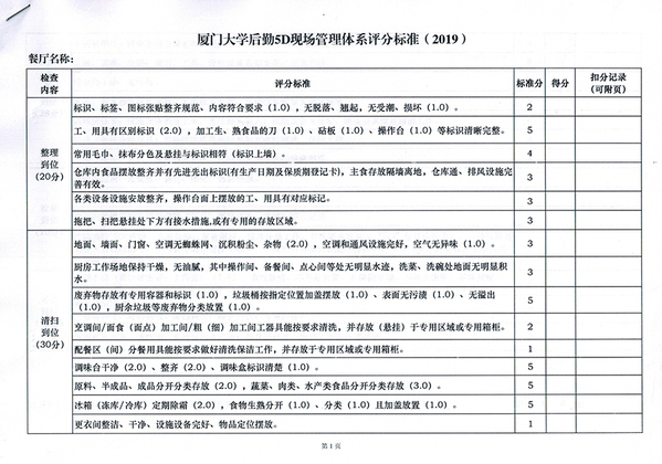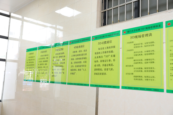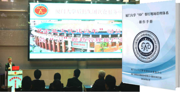 根据《食品安全法》、《餐饮服务食品安全操作规范》、《厦门市学校食堂食品安全管理操作指导手册》等有关法律法规和管理规范,结合多年的餐饮管理经验,饮食服务中心于2016年创立厦门大学后勤“5D”现场管理体系(以下简称:“5D”管理体系)。同年3月,在厦门市市场监督管理局与厦门市教育局联合举办的学校食堂食品安全管理培训观摩会上,中心首次向社会公开推介“5D”管理体系。经过三年的打磨与雕琢,厦门大学后勤“5D”现场管理体系正式成为一个成熟的餐饮管理体系,可推广、可复制,具备了走向市场接受检验的实力。