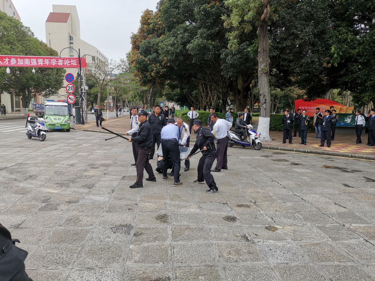 为进一步提高校园安保人员应对暴力恐怖事件的现场处置能力,维护学校安全稳定,保障师生员工人身和财产安全,4月16、18日,学生公寓与环境服务中心联合大学路派出所、校保卫处分别在南校门、海韵学生公寓开展校园突发暴力事件反恐应急处置演练。学校保卫处处长徐跃进、副处长陈锦华及相关人员,学生公寓与环境服务中心主任张金满、相关部门经理到现场观摩指导。